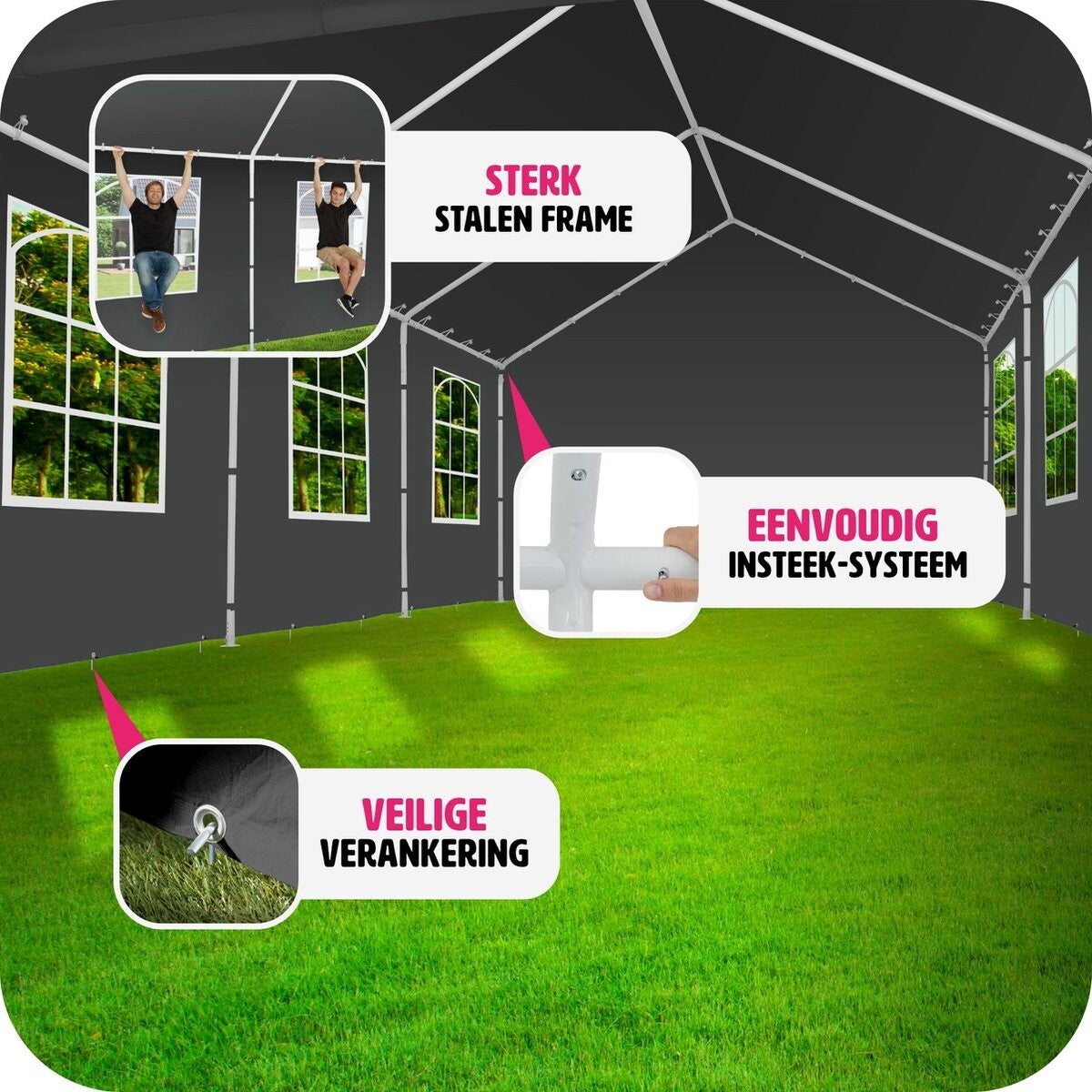 Geef jij binnekort een feestje, en weet je niet zeker of het droog blijft of heb je juist schaduw nodig? Dan hebben wij hier de oplossing. Onze hoogwaardige partytent combineert een aantrakkelijk design, grote functionaliteit en optimale weersbescherming onder een dak. De partytent beschikt over een robuust frame en bestaat uit volledig gepoedercoat staal. Bodemspijkers en spantouwen zorgen voor een vaste verankering aan de grond en leveren wij netjes mee. De zij-elementen kunnen naar behoefte worden aangebracht of weggelaten worden, dit kan je op locatie bekijken. De dakbespanning is uit één stuk en bestaat net zoals de zijdelen uit duurzaam polyester met gelaste naden. Dat maakt onze partytent de perfecte beschermer tegen zon en regen.
