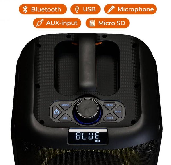 Maak je feest compleet met deze Bluetooth party speaker met ingebouwde discolichten! De dynamische LED-verlichting rondom de twee krachtige 6.5 inch woofers creëren een betoverende lichtshow terwijl je geniet van je favoriete muziek. Dankzij de ingebouwde lichtshowfunctie die synchroon loopt met het ritme van de muziek, kun je helemaal opgaan in de beat en de ultieme feestervaring beleven.