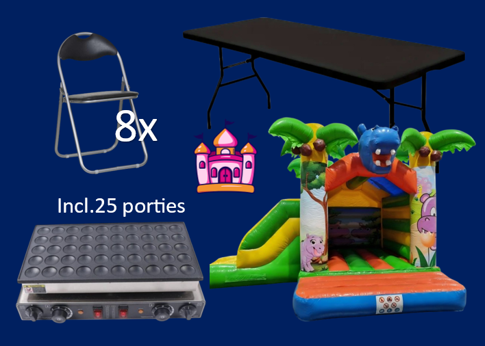 Op zoek naar de ultieme alles-in-één oplossing voor een geslaagd kinderfeest, familiedag of buurtborrel? Met ons Spring & Smul Fun Pakket bent u direct klaar! Dit pakket combineert de stoere Springkussen Hippo met een heerlijke Poffertjesmaker en comfortabele zitplaatsen. Gegarandeerd uren plezier én een volle maag!